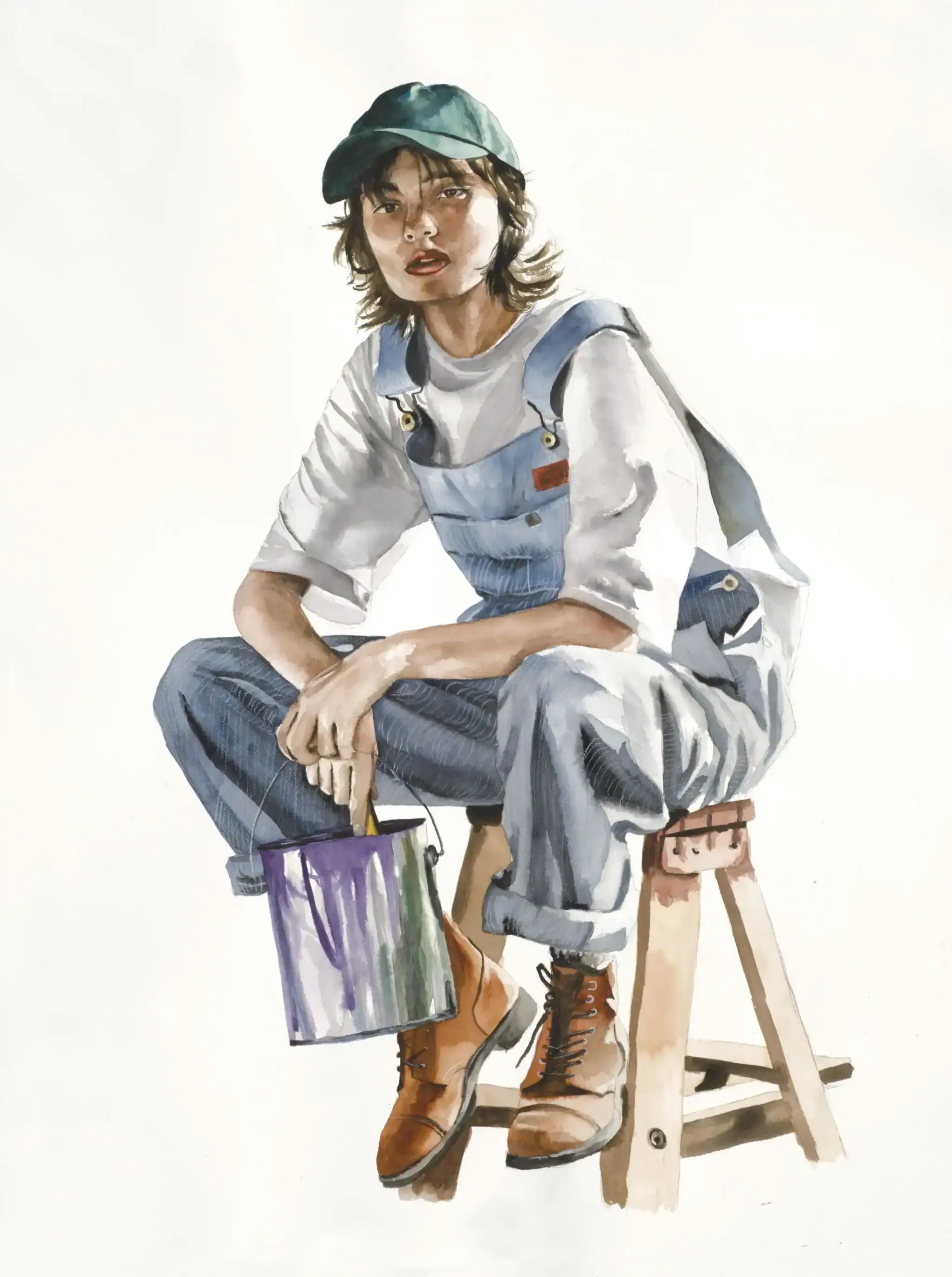 Descripción mujer sentada con bote pintura
